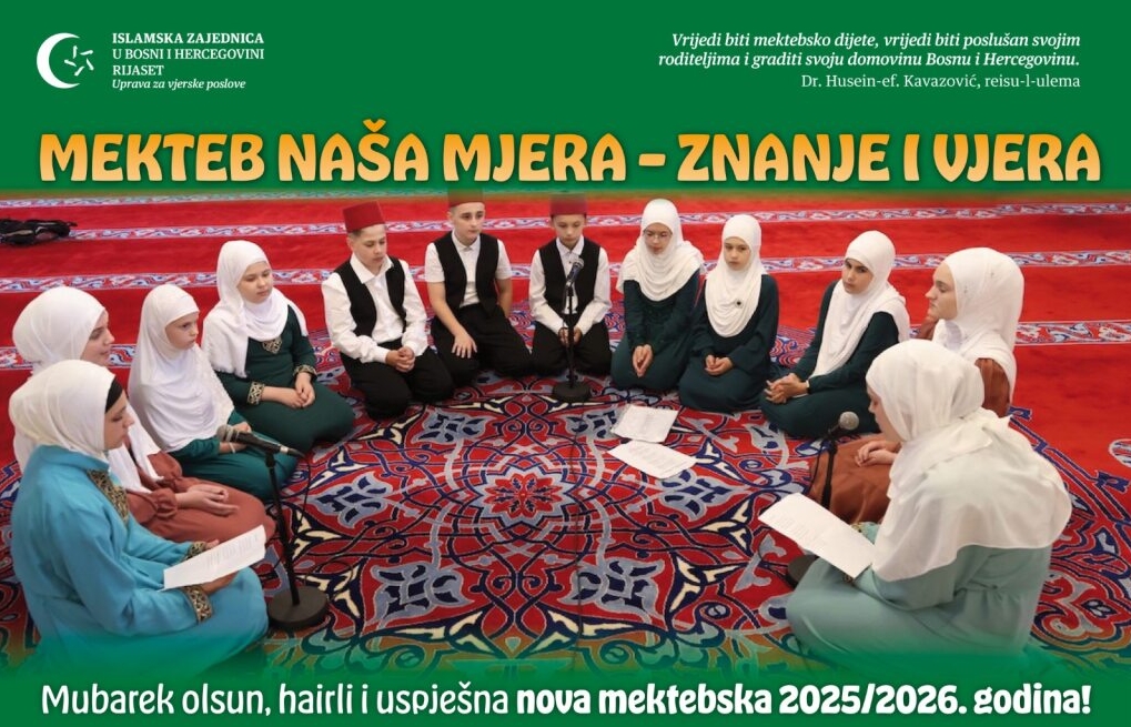 -Mektebska nastava za svu djecu počinje 27. i 28. septembra 2025. godine, u terminima od 10:00h do 12:30h, prema ustaljenom rasporedu za grupe.
