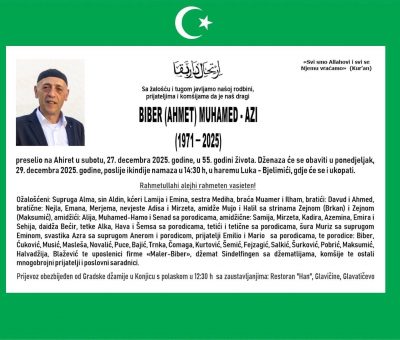 Sa tugom u srcu i velikom žalošću obavještavamo vas da je u subotu, 27.12.2025. godine, oko 19:00 sati, iznenada na ahiret preselio na