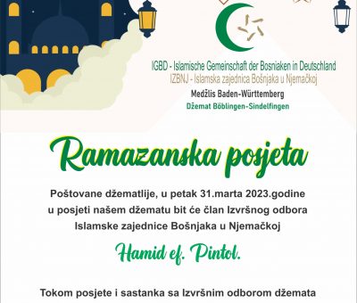 Read MorePoštovane džematlije, u petak 31.marta 2023.godine u posjeti našem džematu bit će član Izvršnog odbora Islamske zajednice Bošnjaka u Njemačkoj Hamid e