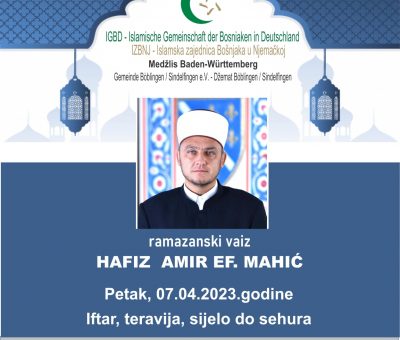 Read MorePoštobane džematlije, u petak, 07.04.2023.godine u gostima nam je ramazanski vaiz HAFIZ AMIR EF. MAHIĆ Petak, 07.04.2023.godine Iftar, t