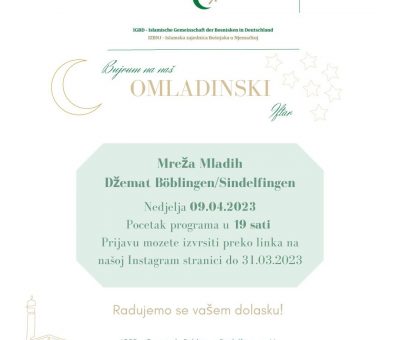 Read MoreOmladinski iftar Mreže mladih našeg džemata održat će se u nedjelju, 9.aprila 2023.godine u prostorijama našeg džemata. Početak pro