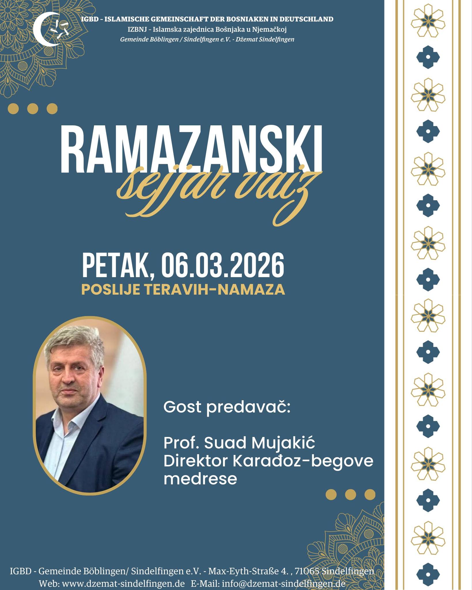 U petak, 06.03.2026. poslije teravih-namaza, gost u nasem džematu bit će prof. Suad Mujakić, direktor Karađoz-begove medrese u Mostaru.